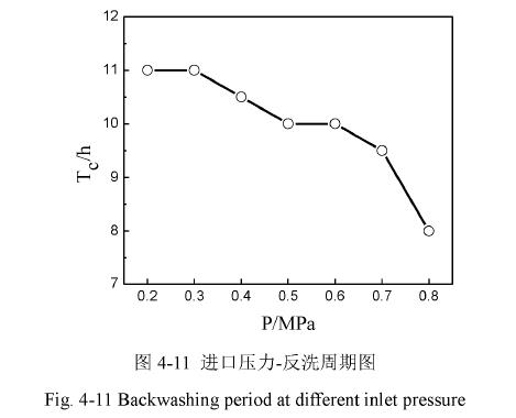 從圖來看,反洗的周期在進口壓力超過以后迅速下降。經(jīng)過分析,可能是因為壓力過大以后,在陶瓷膜的內(nèi)外壁的壓差也隨之,容易在膜的表面形成較致密的污染層;另一方面,過大的壓力導致沉淀區(qū)出現(xiàn)過多的擾動,使本已沉淀下來的磷酸銨鎂浮動起來,惡化了膜表面的堵塞情況。